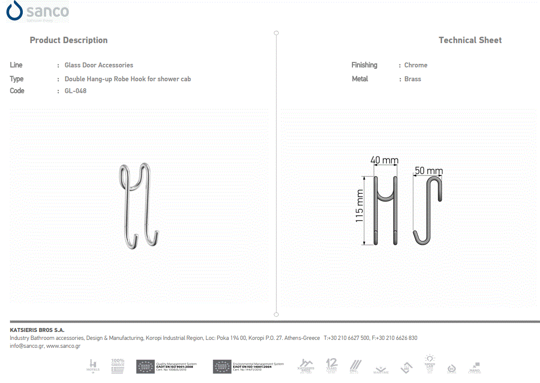 Άγκιστρο Ντουζιέρας Διπλό W4xD5xH11,5 cm Chrome Sanco Glass Door Accessories GL-048-A03