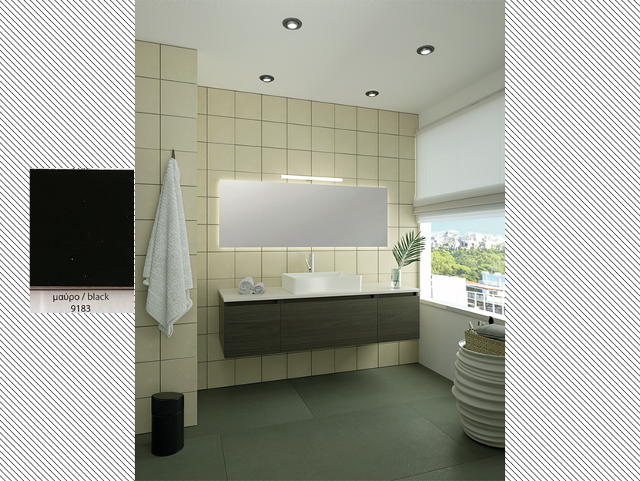Σετ Μπάνιου Elegance Soul 003 της εταιρείας Savvopoulos, αποτελούμενο από Βάση,Πάγκο, Νιπτήρα, Καθρέπτη & Φωτιστικό.