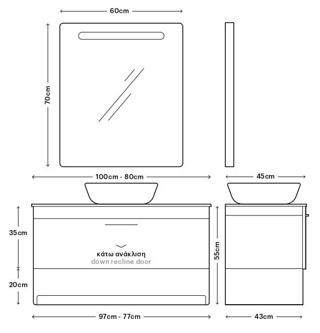 Κρεμαστό έπιπλο μπάνιου με ντουλάπι ανακλινόμενο και ράφι.Περιλαμβάνει βάση, πάγκο, νιπτήρα, και καθρέπτη.