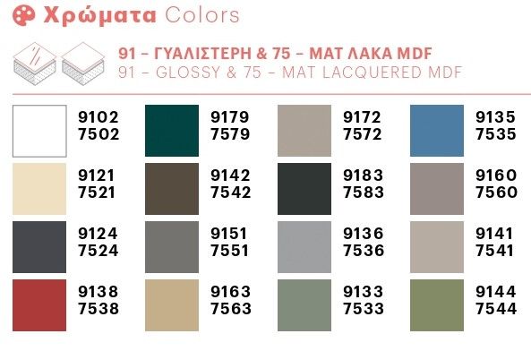 Διαθέσιμο σε πολλές χρωματικές επιλογές, 16 αποχρώσεις Λάκας Γυαλιστερής ή Ματ & 6 Αποχρώσεις Επενδεδυμένης Μελαμίνης σε MDF.