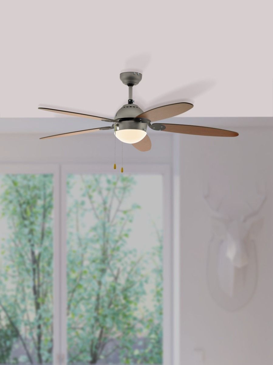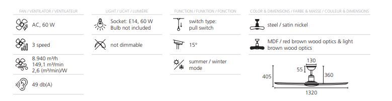 Κινητήρας AC κατασκευασμένος από μέταλλο σε νίκελ χρώμα και λεπίδες από ξύλο(MDF) βαμμένες σε καφέ χρώμα, ενώ η πηγή φωτισμού καλύπτεται από λευκό οπάλ γυαλί.