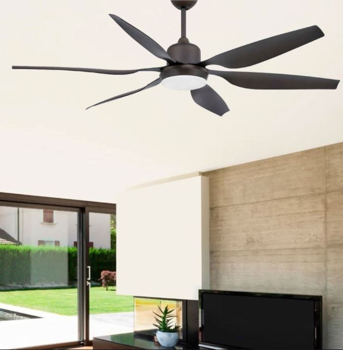 Large brown ceiling fan with 6 aerodynamic blades which increase the feeling of freshness.