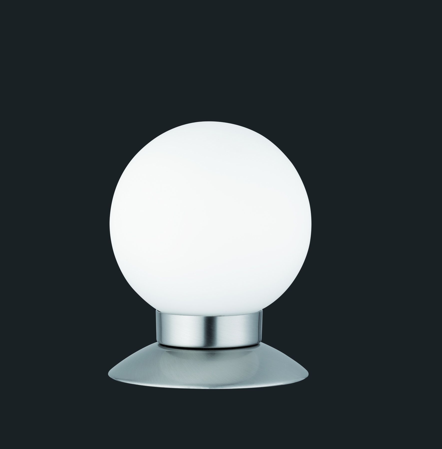 The table lamp has a base in matt nickel and a round, white glass that emits an even light.