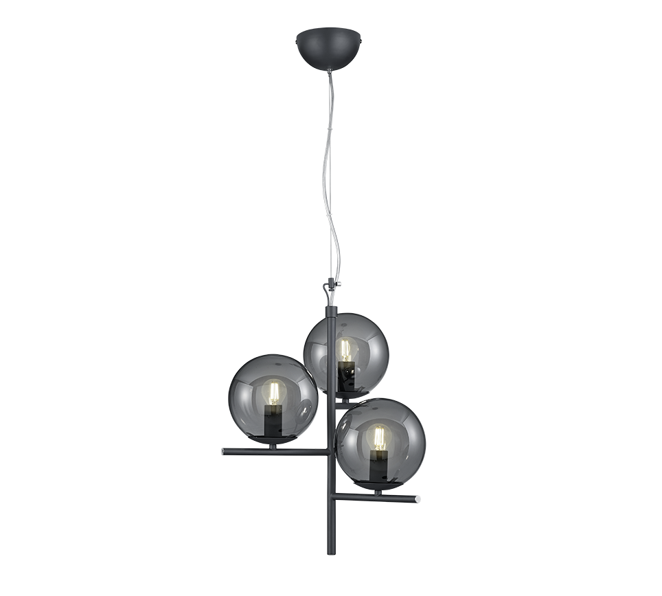 Τρίφωτο κρεμαστό φωτιστικό από την εταιρεία Trio Lighting σε μαύρο χρώμα, με υποδοχές για 3 λαμπτήρες και ντουί E14. Είναι κατασκευασμένο από γυαλί, ένα υλικό ιδιαίτερα ελκυστικό για τη διακόσμηση και τον φωτισμό του χώρου σας. Το γυαλί επιτρέπει τη διάχυση του φωτός με ομοιόμορφο τρόπο, δημιουργώντας μια ισορροπημένη φωτεινότητα στον χώρο. Τα κρεμαστά φωτιστικά οροφής από γυαλί είναι εύκολο να καθαριστούν και να συντηρηθούν, απλά χρησιμοποιώντας ένα πανί για να διατηρήσετε τη λάμψη τους.
