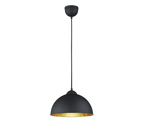 The lampshade is made of metal and is painted black on the outside and gold on the inside.