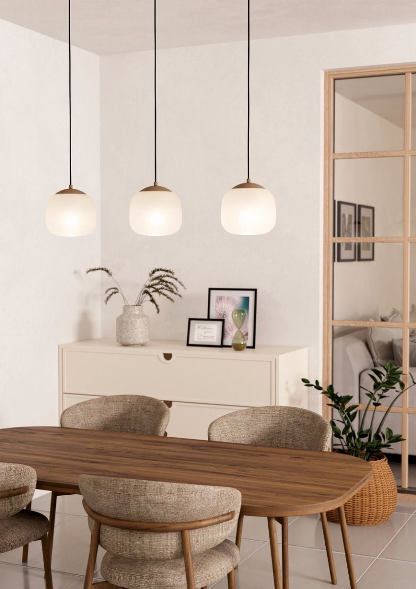 Τρίφωτο κρεμαστό φωτιστικό από την εταιρεία Eglo σε μπεζ χρώμα, με υποδοχές για 3 λαμπτήρες και ντουί E27.