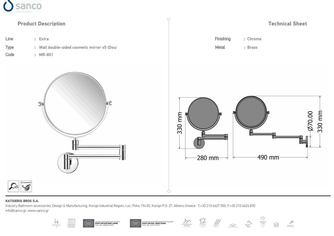 Μεγεθυντικός Καθρέπτης Επιτοίχιος Ø20 εκ. 2 Όψεων x5 Χρωμέ Sanco Mirrors MR-801-Α03