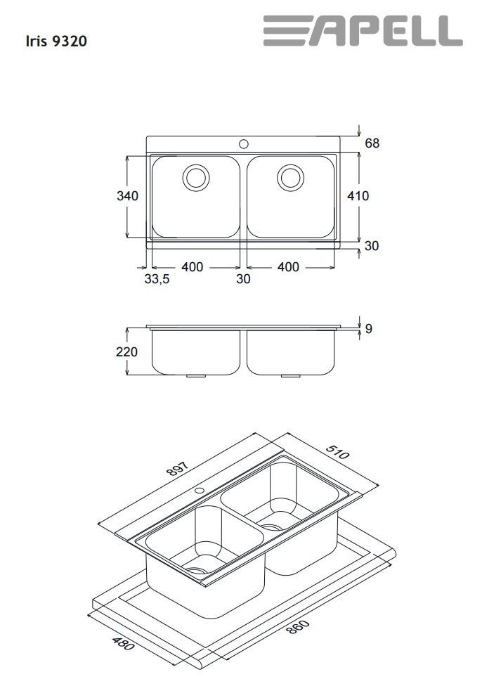 Νεροχύτης Κουζίνας Ανοξείδωτος Iris 89,7x51 Αpell Inox silver glass 9320-110441