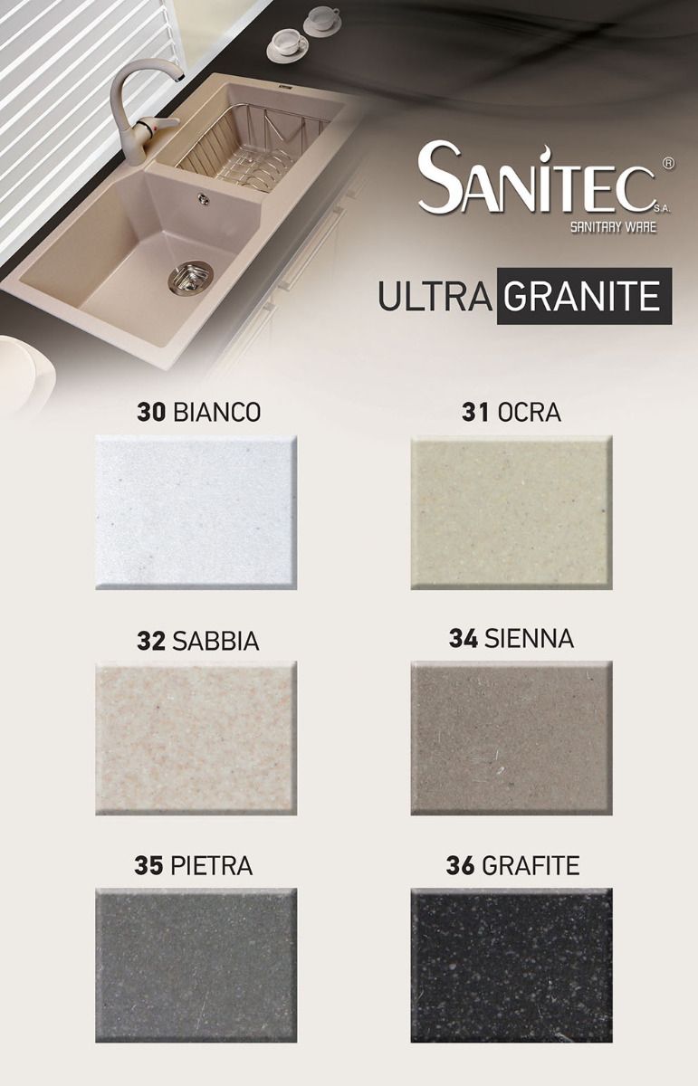 - Για τη σειρά νεροχυτών “ULTRA GRANITE”, η SANITEC έχει ολοκληρώσει την πιστοποίηση της χημικής τους σύστασης στα Γερμανικά εργαστήρια “LGA”(TÜV Rheinland LGA), σύμφωνα με τον Ευρωπαϊκό Κανονισμό περί «ασφάλειας επαφής τροφίμων».