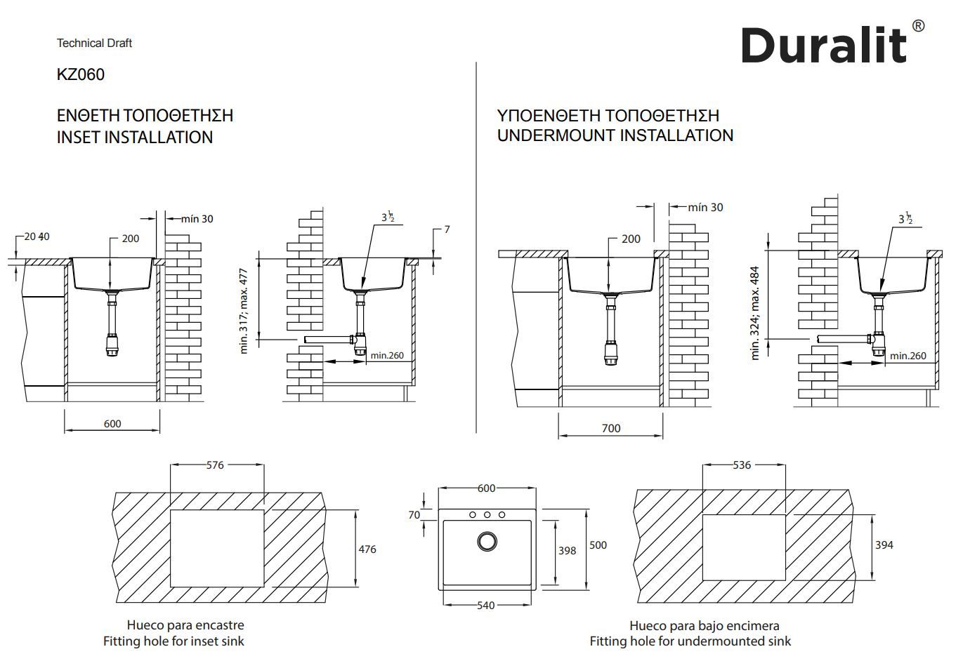 Νεροχύτης Κουζίνας Συνθετικός 60x50cm Ένθετος Ερμάριο 60cm Concrete Duralit KZ060-450