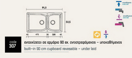 Περιγραφή: Νεροχύτης ένθετος αντιστρεφόμενος με 2 γούρνες