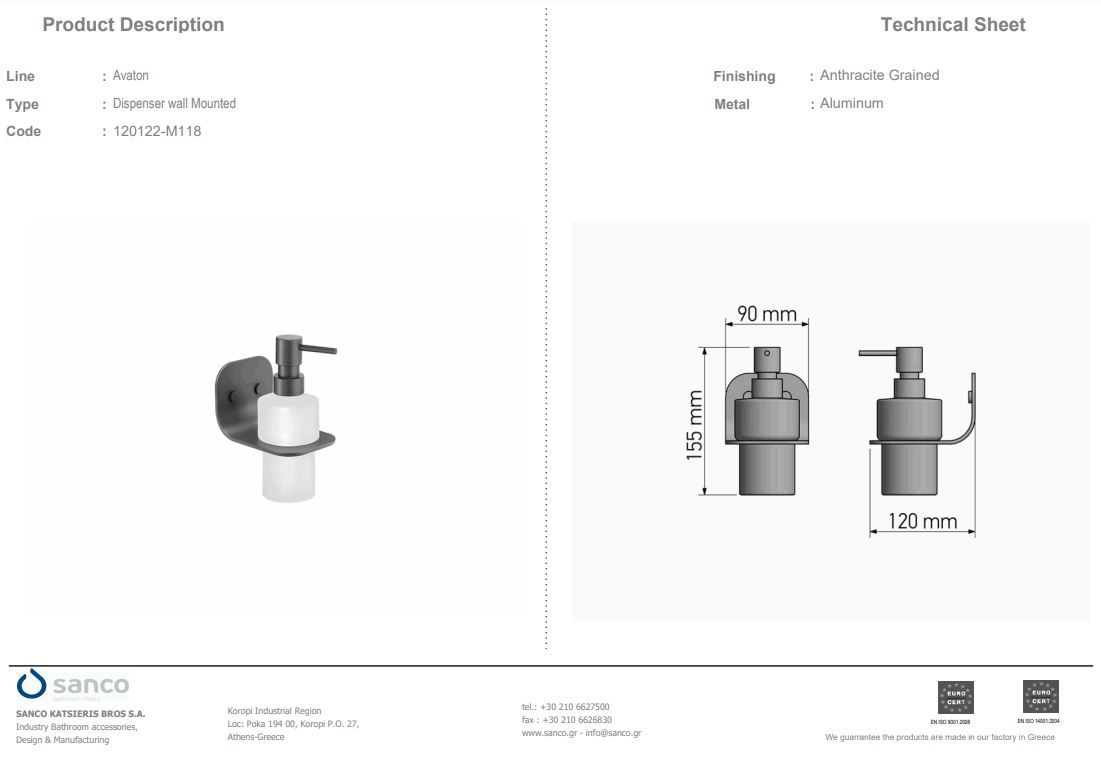 Ντισπένσερ Επίτοιχο Graphite Dark Sanco Avaton 120122-122Ειδική Τιμή 72,00 € Κανονική τιμή 80,00 € -