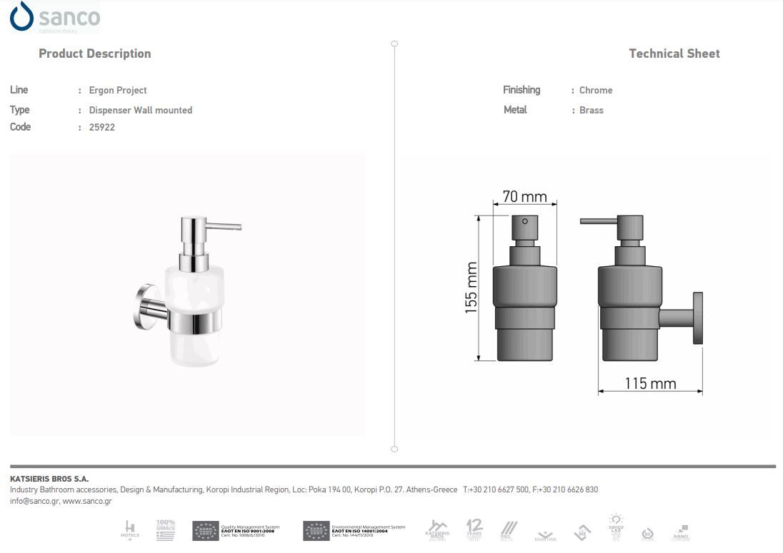 Ντισπένσερ Επιτοίχιο Bronze Mat Sanco Ergon 25922-M25
