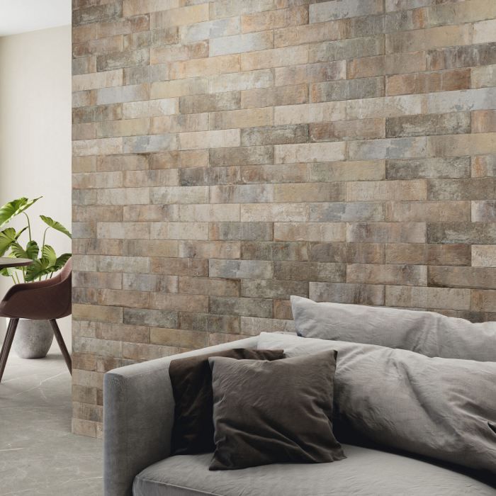 Kirkwall Mud – Rustic brick effect wall covering tile in 7,5×30 cm dimensions, by Baldocer.