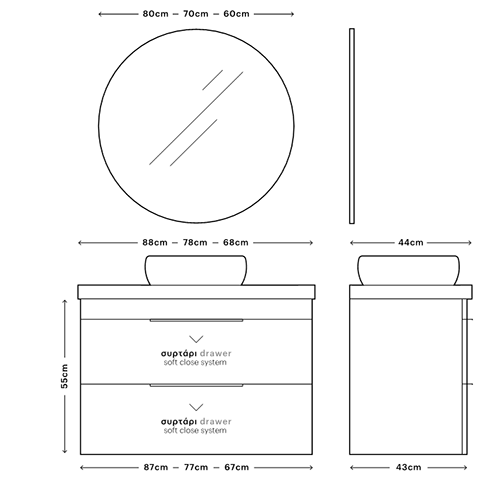 Σετ Έπιπλο Μπάνιου 80*Y55*43 εκ. Βάση -Νιπτήρας, Πάγκος Μασίφ Ξύλο Πεύκο 40mm, Καθρέπτης Round Led Savvopoulos Likno IV