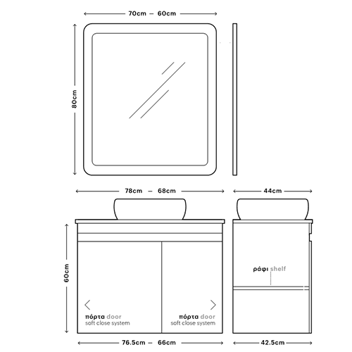 Η βάση του επίπλου διαθέτει αποθηκευτικό χώρο 2 ντουλάπια με ράφι όπου μπορείτε να τοποθετήσετε πετσέτες, καλλυντικά και γενικά οτιδήποτε είναι χρήσιμο για την καθημερινότητα σας.
