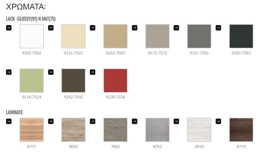 Η συγκεκριμένη σύνθεση της σειράς παράγεται σε 4 διαστάσεις 100-80-65-55cm με νιπτήρα ενιαίο πορσελάνης, σε εννέα αποχρώσεις λάκας σε γυαλιστερό ή ματ τελείωμα και σε έξι αποχρώσεις μελαμίνης όψης ξύλου
