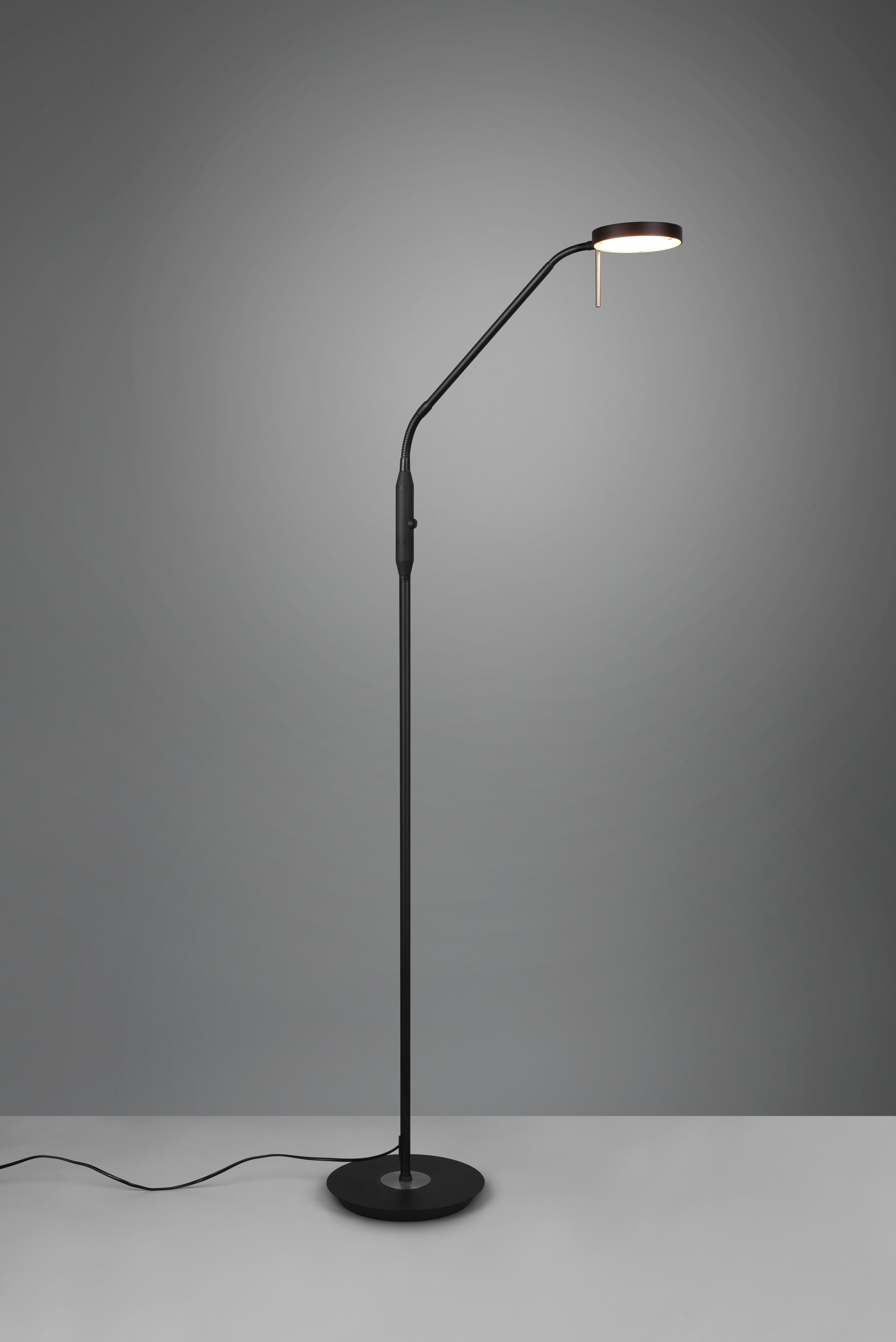 Φωτιστικό δαπέδου Monza της Trio Lighting σε μαύρο χρώμα, με ενσωματωμένο LED. Το ενσωματωμένο LED εκπέμπει θερμό λευκό φως, το οποίο αποδίδεται στην κλίμακα Kelvin με τιμές από 2400Κ έως 3000Κ. Αυτοί οι τόνοι του λευκού είναι πιο πορτοκαλί σε σχέση με το φυσικό φώς.