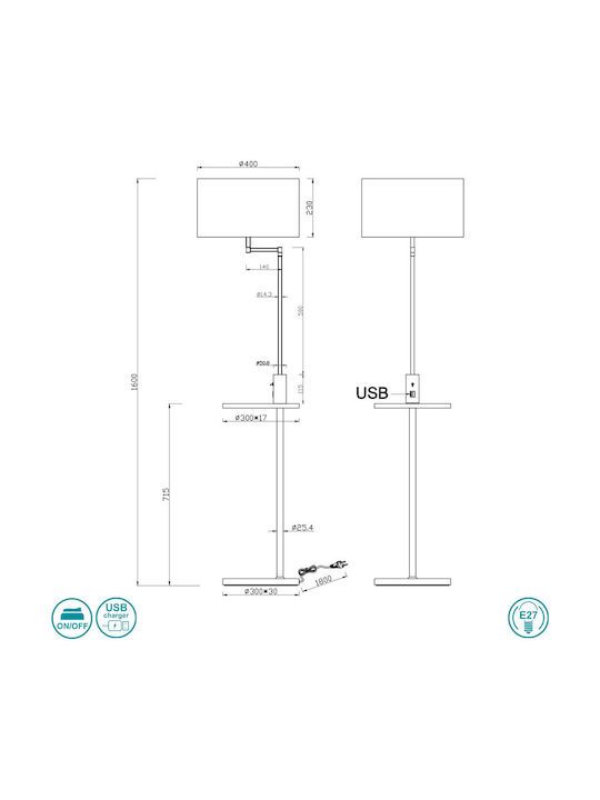 Φωτιστικό Επιδαπέδιο με Βοηθητικό Τραπεζάκι Υ160 1xE27 Μέταλλο Μαύρο Νίκελ Ματ-Υφασμάτινα Αμπαζούρ Trio Lighting Claas 400400107
