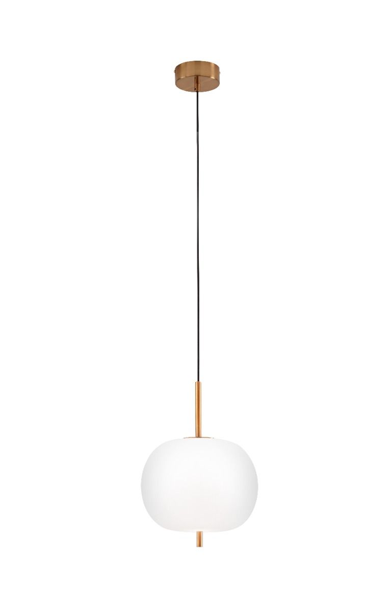 Hanging lamp in frosted white blown glass metal frame with brushed gold finish.