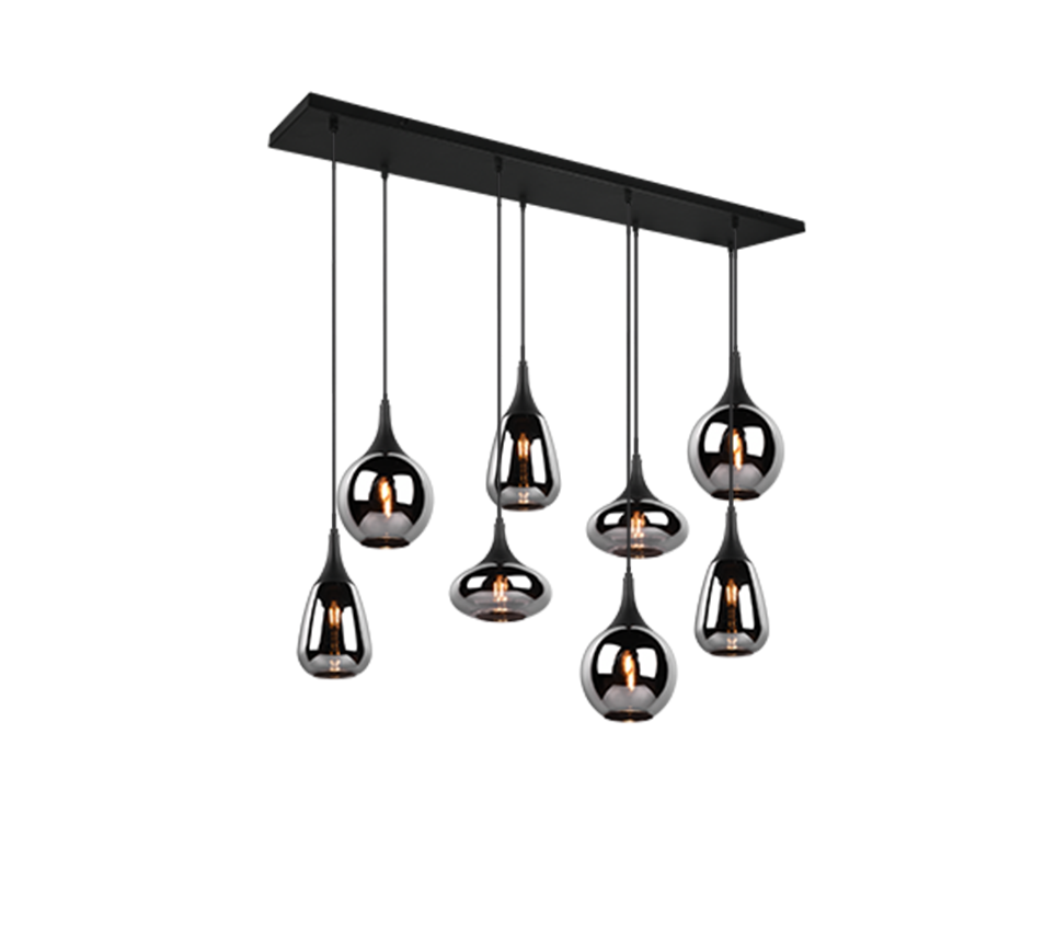 The different shapes of the eight shades and the composition of metal and glass create a beautiful and unique light atmosphere and breathe a modern touch into your dining area.
