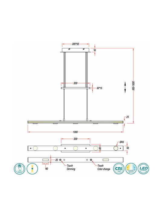 Φωτιστικό Κρεμαστό Ράγα L100x12xH160cm Led Smd 7x4w 7x380lm 3000-5000K Μαύρο Ματ Trio Lacal 379190732