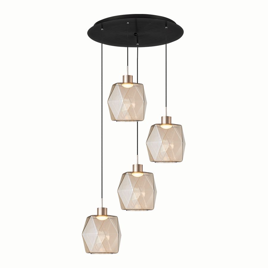 Τετράφωτο κρεμαστό φωτιστικό σε ροζέτα κατασκευασμένο από χειροποίητα γυαλιά σε μελί χρώμα και μεταλλική βάση σε μαύρο χρώμα.