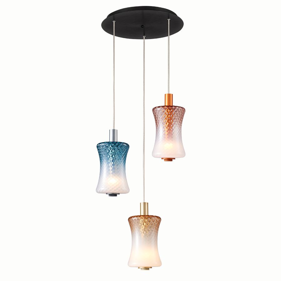 Τρίφωτο κρεμαστό φωτιστικό σε ροζέτα κατασκευασμένο από χειροποίητα γυαλιά σε μπλέ, μελί και απαλό ροζ χρώμα και μεταλλική βάση σε μαύρο χρώμα.| Χρώμα | RGB-Πολύχρωμο-Χρωματιστό |