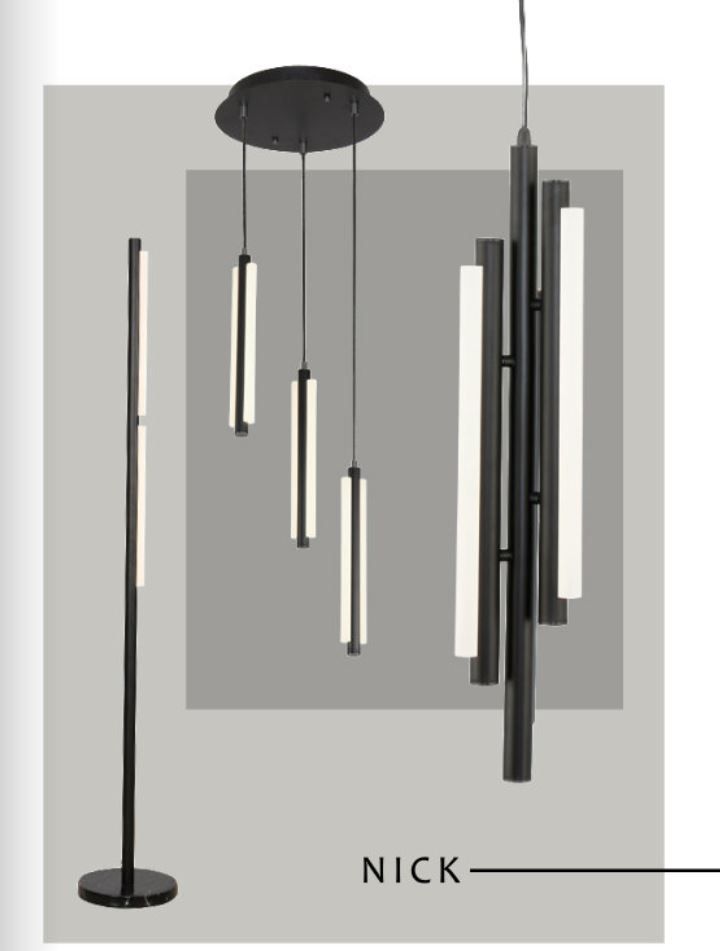 Στη σειρά φωτιστικών Nick διατίθενται : Κρεμαστό Ράγα, Σωλήνες, Ροζέτα καθώς και Επιδαπέδιο.