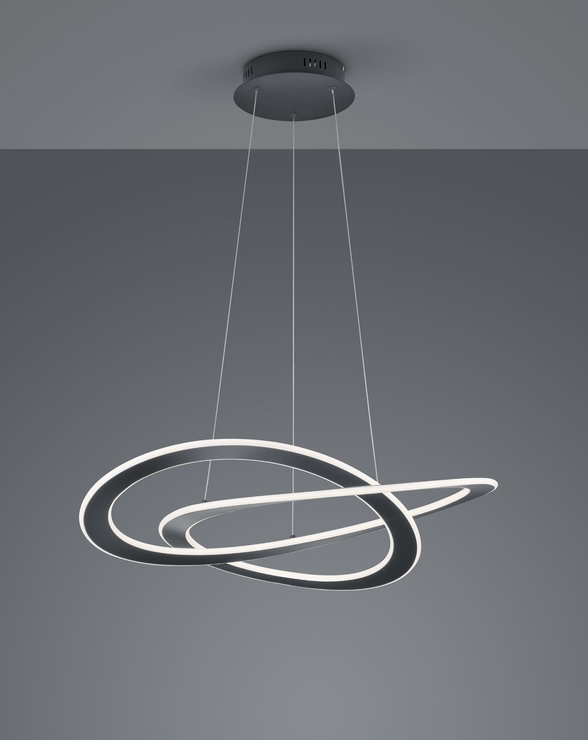 Kρεμαστό φωτιστικό με ενσωματωμένο LED από την εταιρεία Trio Lighting σε γκρι χρώμα. Είναι κατασκευασμένο από μέταλλο, ένα υλικό δημοφιλή στα κρεμαστά φωτιστικά οροφής, καθώς πέρα από τη μοντέρνα νότα που προσφέρει, είναι ιδιαίτερα ανθεκτικό στον χρόνο. Καθαρίζεται εύκολα με ένα πανί. Τέλος, το LED εκπέμπει θερμό λευκό φως, το οποίο αποδίδεται στην κλίμακα Kelvin με τιμές από 2400Κ έως 3500Κ. Αυτοί οι τόνοι του λευκού είναι πιο κίτρινοι σε σχέση με το φυσικό φώς.