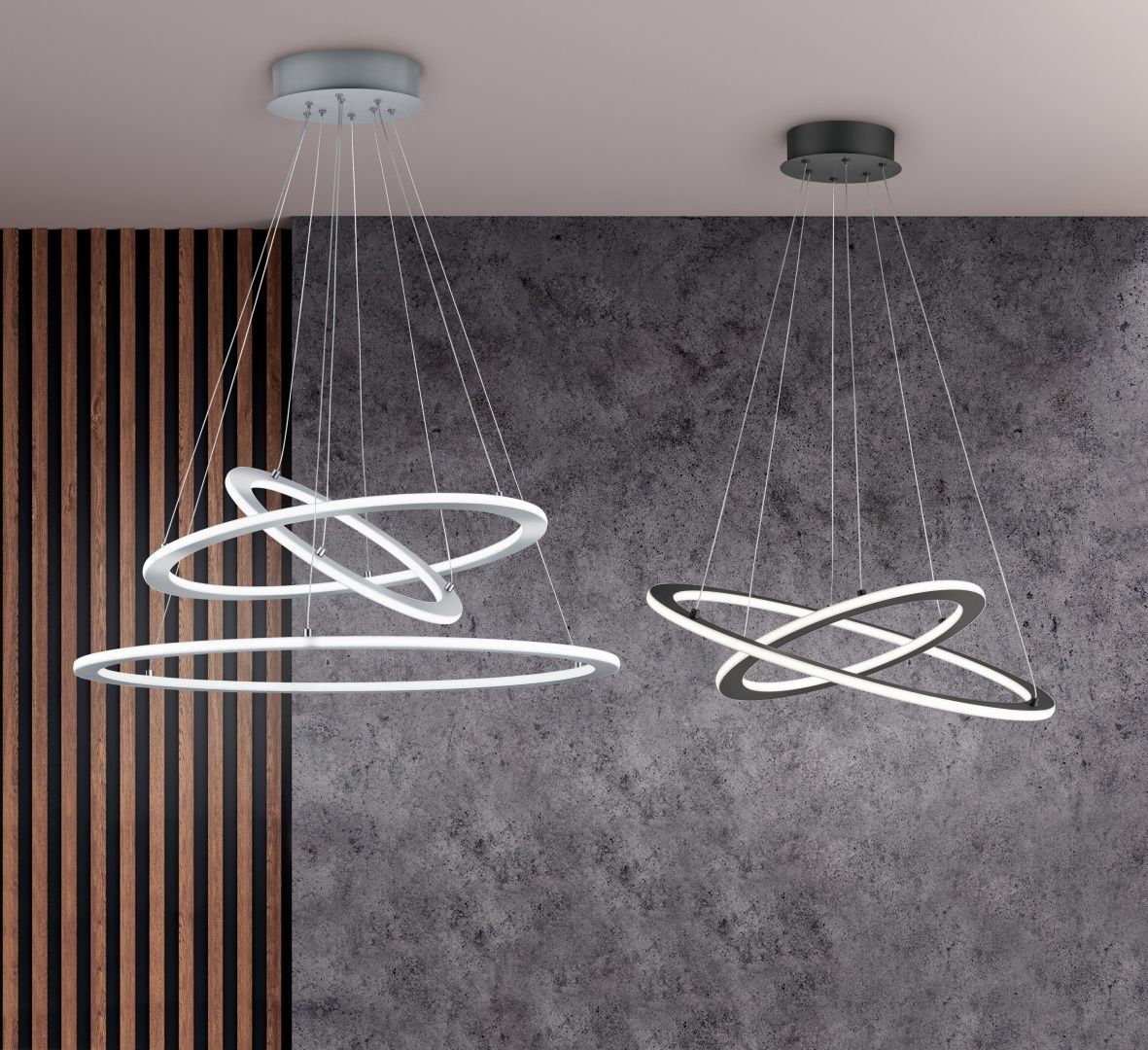 The pendant luminaire consists of three rings, the lower ring has a diameter of 80cm, the outer ring of the two interlocking rings has a diameter of 60cm and the inner ring 40cm.