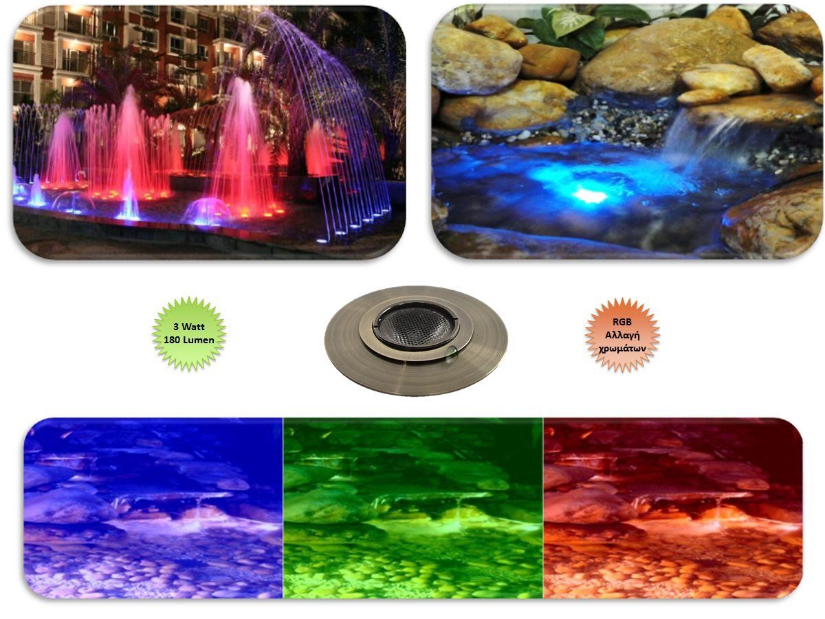 Στεγανότητα: IP68Ένταση φωτός: 180 LumenΧρώμα: Εναλαγή χρωμάτων σε μίξη των βασικών, red, green, blue. Διάσταση φωτιστικού: Ø80 * 42mmΑδιάβροχο καλώδιο μήκους 4,5m διατομής 2x0.75mmΣύνδεση με ανθυγρό βύσμα 2 pinΘερμοκρασίες λειτουργίας: -20Co + 45CoΠιστοποιητικά:CE και ROHS
