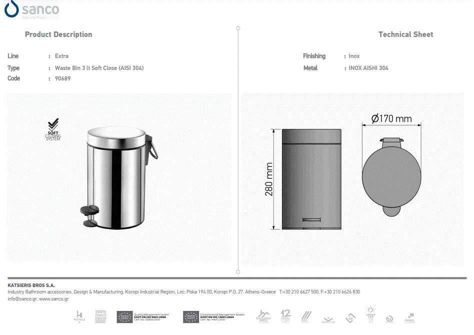 Χαρτοδοχείο 3lt Soft Closιng System Black Mat Sanco Waste Bins 90689-M116