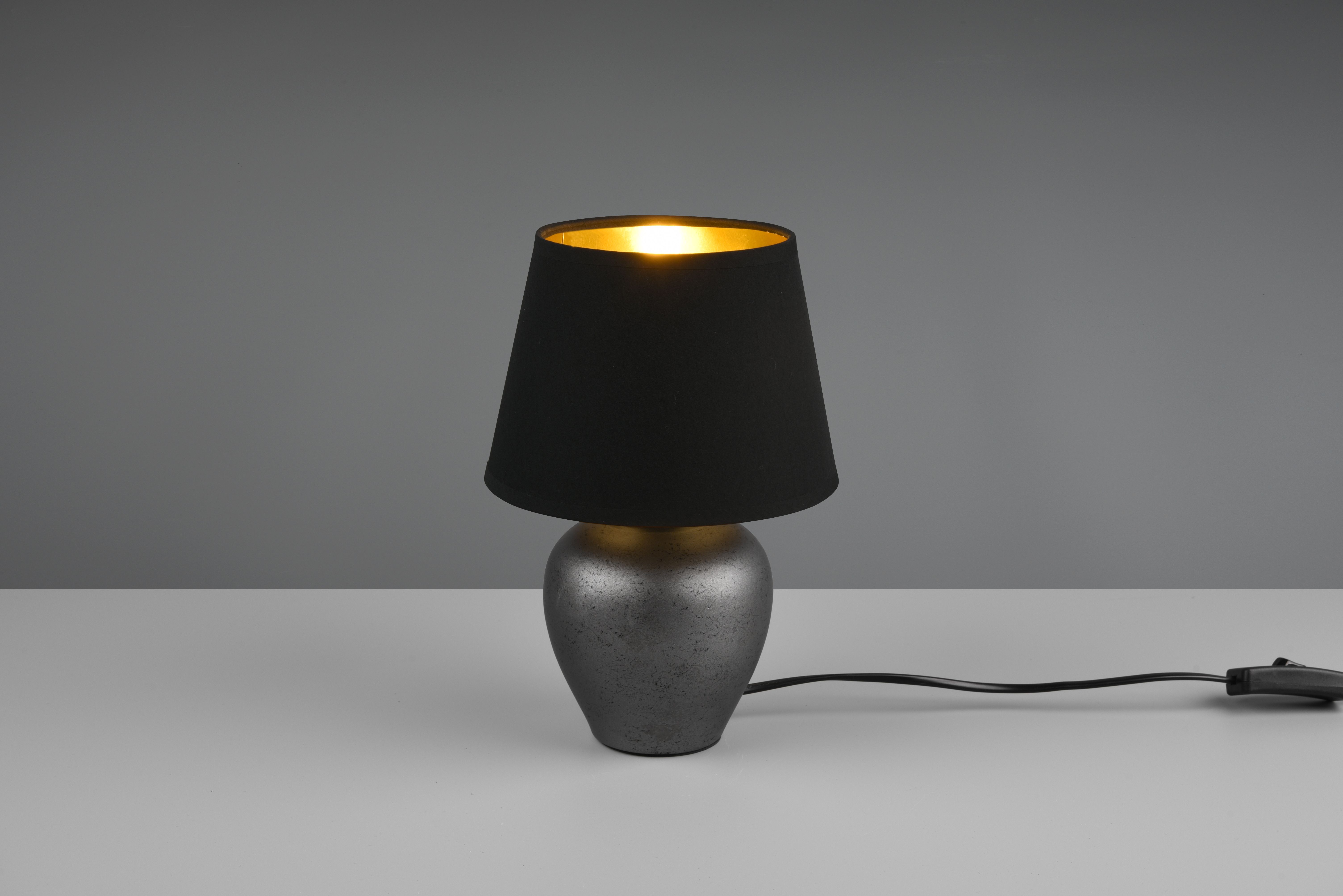 The ABBY table lamp has a modern ceramic look. Stylishly designed, the lamp impresses with its fabric shade, which provides beautiful accent lighting. Placed on a bedside table or chest of drawers, the lamp is a decorative eye-catcher both on and off. The ceramic lamp in antique nickel is in combination with the fabric shade in gold / black a stylish furnishing element. For energy-saving lighting, it is recommended to use an LED illuminant. These are an optimal alternative to conventional halogen lamps and stand for a high quality of light and energy savings of up to 80%. In addition, LED lamps help you benefit from a long service life, low heat generation and at the same time protect the environment.