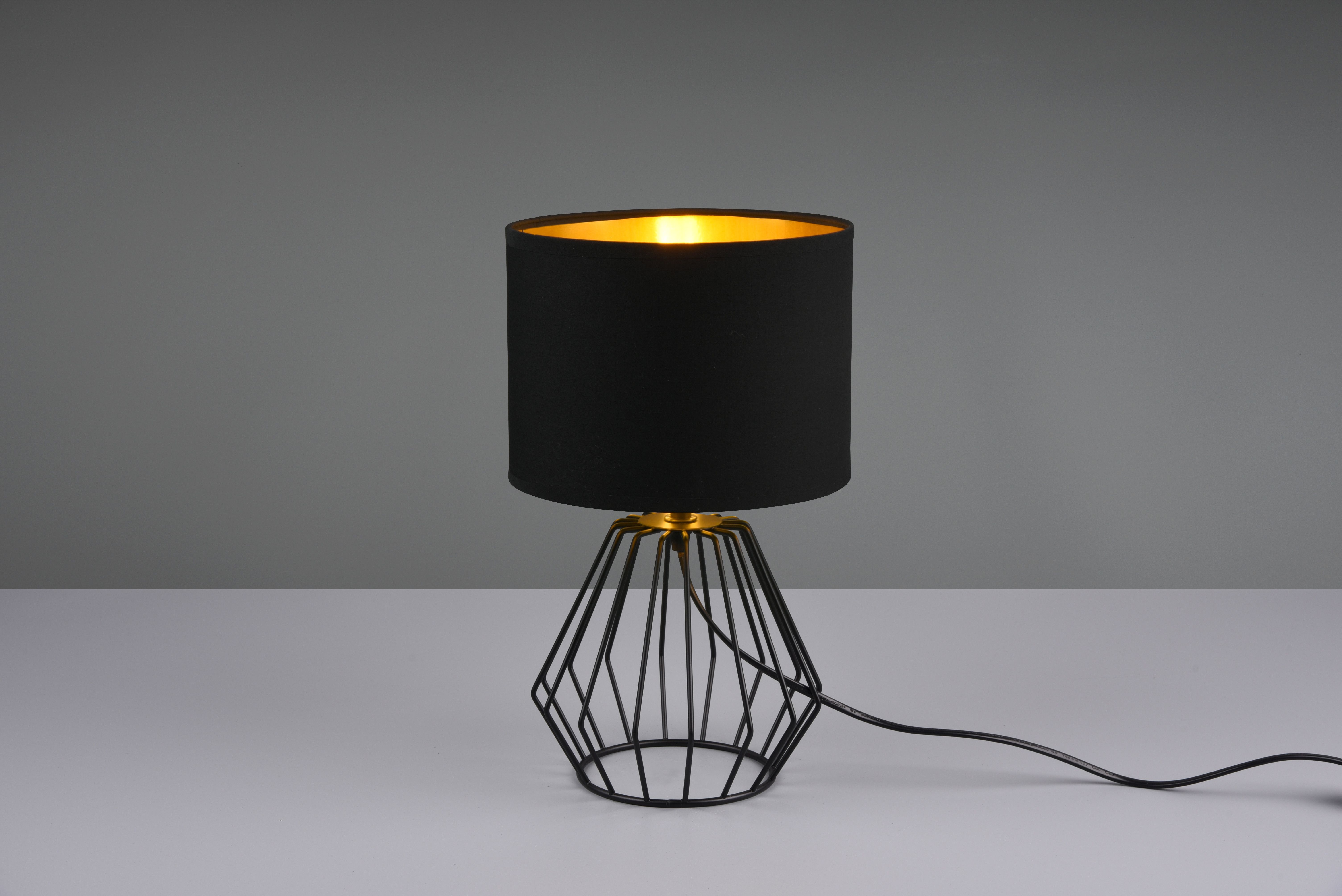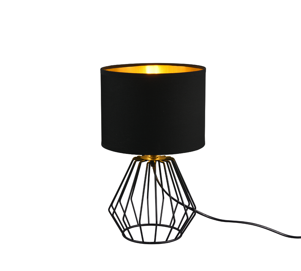 The metal-fabric mix makes the table lamp CHUCK a decorative home accessory with charisma. Placed on the nightstand or on the dresser, the lamp is a decorative eye-catcher when switched on or off. In the colour combination black / gold the lamp is a modern and stylish furnishing element. For energy-saving lighting, it is recommended to use an LED illuminant. These are an optimal alternative to conventional halogen lamps and stand for a high quality of light and energy savings of up to 80%. In addition, LED lamps help you benefit from a long service life, low heat generation and at the same time protect the environment.