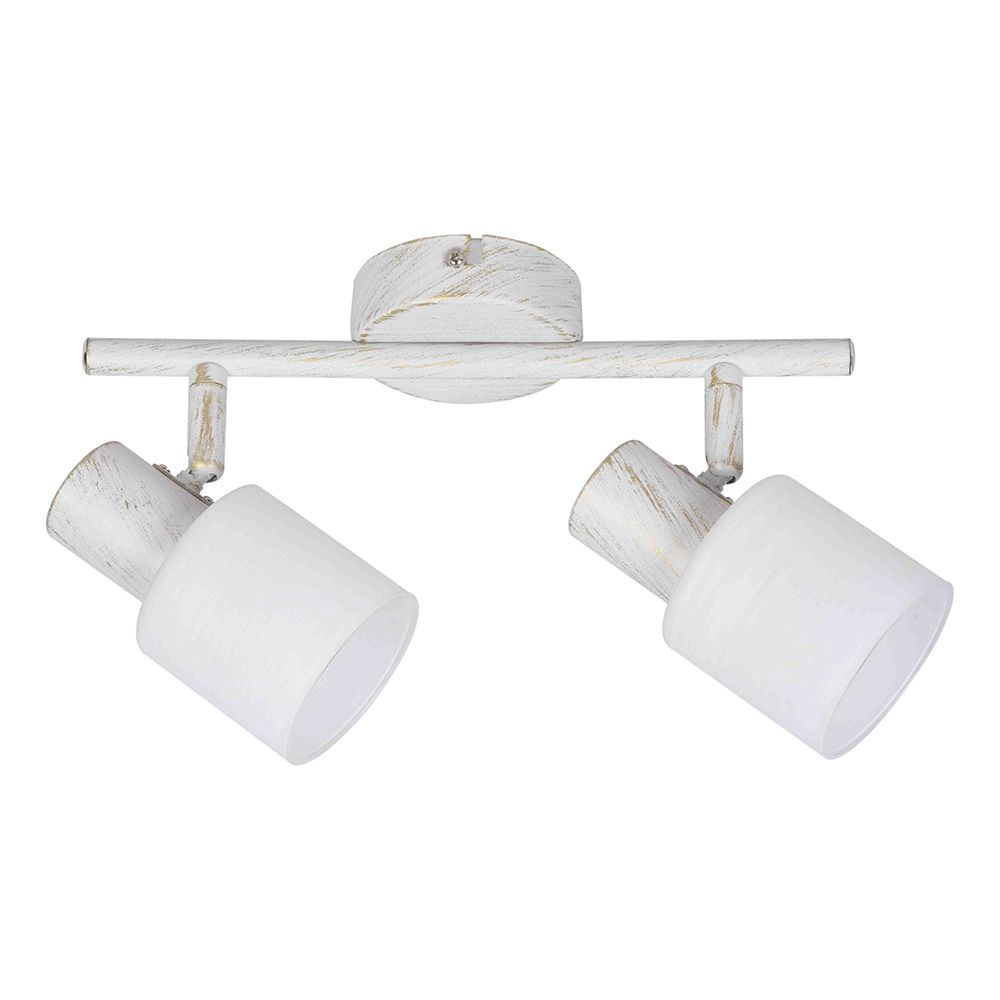 Πρόκειται για ένα μεταλλικό σποτ σε απόχρωση λευκής πατίνας με δύο λαμπτήρες. Το λευκό γυαλί επιτρέπει στο φως να διαχέεται ομοιόμορφα στον χώρο. Το μπροστινό μέρος του κινείται προς οποιαδήποτε κατεύθυνση. Πρόκειται για ένα μεταλλικό σποτ σε απόχρωση λευκής πατίνας με δύο λαμπτήρες. Το λευκό γυαλί επιτρέπει στο φως να διαχέεται ομοιόμορφα στον χώρο. Το μπροστινό μέρος του κινείται προς οποιαδήποτε κατεύθυνση.