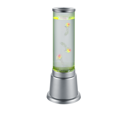 The JELLY LED water column - furnishing accessory and lighting in one. As soon as the column is switched on, the little jelly fish start to move in the clear liquid. The built-in RGB colour changer allows the column to take on different colours and conjures up a play of light in your living space. The water column sits on a titanium-coloured plastic base and has a height of 36 cm and a diameter of 12.5 cm.