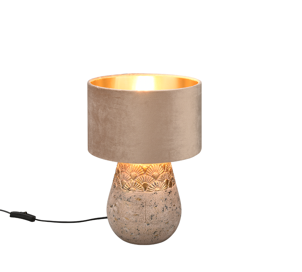 The exciting combination of the materials velvet and ceramic guarantee an eye-catcher. The table lamp KIRAN appears in a modern as well as eye-catching design and thus attracts all eyes. The table lamp can be used in many ways, e.g. as a bedside lamp in the bedroom or on the chest of drawers to create decorative accents. A warm and soft light is emitted via the cylindrical lampshade, which underlines a pleasant light atmosphere. The combination of grey ceramic with golden accents and a beige velvet shade creates a graceful appearance. For energy-saving lighting, it is recommended to use an LED illuminant. These are an optimal alternative to conventional halogen lamps and stand for a high quality of light and energy savings of up to 80%. In addition, LED lamps help you benefit from a long service life, low heat generation and at the same time protect the environment.