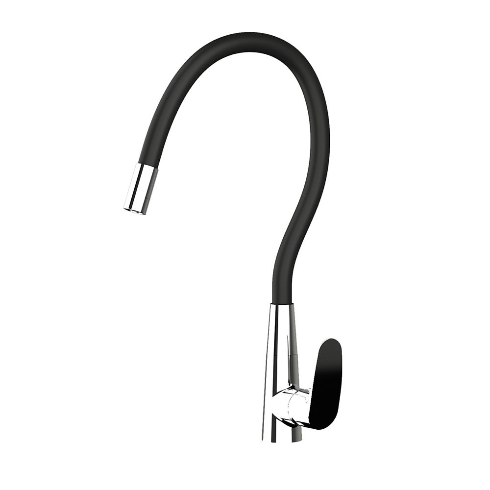 Μπαταρία κουζίνας Orabella, Flex χρωμέ με εύκαμπτο, περιστρεφόμενο, μαύρο ματ ρουξούνι από σιλικόνη. Πρόκειται για μια μοντέρνα μπαταρία πάγκου, η οποία είναι κατασκευασμένη από τον οίκο Orabella, από υψηλής ποιότητας ορείχαλκο και μαύρη ματ σιλικόνη.