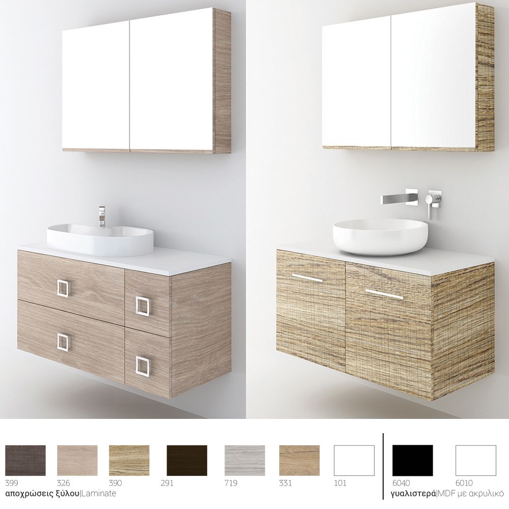 Υλικό επίπλου μελαμίνη με PVC για μεγαλύτερη αντοχή στο χρόνο και σε μεγάλη γκάμα χρωματικών επιλογών. Χρήση μηχανισμών κλεισίματος soft close και blumotion (σε συρτάρια) που φέρουν την υπογραφή της κορυφαίας εταιρείας BLUM. Διατίθεται με ντουλάπι καθρέπτη με δύο πόρτες ή με καθρέπτη εταζέρα που μπορεί να πλαισιωθεί από δύο πρόσθετα ντουλάπια 25 εκατοστών. Ο καθρέπτης Infinity αποτελεί μια τρίτη επιλογή χωρίς αποθηκευτικό χώρο. Ο τελευταίος βγαίνει μόνο σε αποχρώσεις ξύλου Laminate. Συμπεριλαμβάνονται στη βάση δύο, τρείς ή τέσσερεις, χρωμέ λαβές επίπλων, δικής σας επιλογής σε τρία σχέδια, ανάλογα με τη μορφολογία της βάσης. Ενώ υπάρχει δυνατότητα προσθήκης στο πακέτο μαύρων ματ γραμμικών λαβών, κατόπιν επιλογής. Στην περίπτωση τεσσάρων συρταριών ή μιας πόρτας και δύο συρταριών μπορείτε να επιλέξετε ανάμεσα στα πόμολα Μ1, Μ4 ή Μ5 ή σε μαύρο πόμολο M1. Σε βάση με δύο πόρτες μπορεί να τοποθετηθούν πόμολα χρωμέ, γραμμικά, L1, L2 ή L3 ή μαύρο ματ L1. Και τέλος στην περίπτωση βάσης με δύο πόρτες – δύο συρτάρια τα πόμολα σε χρωμέ απόχρωση είναι φιξαρισμένα, γραμμικά (S1,M1) αλλά μπορείτε να αλλάξετε την εικόνα του επίπλου σας προσθέτοντας μαύρα ματ πόμολα (S1,M1). Ομοίως μπορείτε να συνδυάσετε φωτιστικό επίπλου σε χρωμέ ή μαύρη απόχρωση. Η συνολική σύνθεση του επίπλου αποστέλλεται συναρμολογημένη σε 3 τεμάχια (βάση, νιπτήρας και καθρέπτης) και σε περίπτωση που επιλέξετε στήλες μπάνιου για να αυξήσετε τους αποθηκευτικούς χώρους στο μπάνιο σας, αυτές παραδίδονται συναρμολογημένες. Κατόπιν επιλογής, η σύνθεση μπορεί να συνοδευτεί με γραμμικό φωτιστικό μπάνιου Led 40 ή 60 εκατοστά ισχύος 8 και 12 watt αντιστοίχως, σε χρωμέ ή και μαύρο ματ χρώμα. Στην τιμή δεν συμπεριλαμβάνεται ο νιπτήρας, η μπαταρία και η βαλβίδα του νιπτήρα, μπορείτε να προσθέσετε επικαθήμενο νιπτήρα και ορειχάλκινη βαλβίδα κλικ-κλακ για νιπτήρες χωρίς υπερχείλιση. Ομοίως μπορείτε να προσθέσετε μπαταρία νιπτήρος που φέρει την υπογραφή κορυφαίων εταιρειών στο σχεδιασμό ειδών υγιεινής, όπως Pentagono, Orabella by Armando Vicario και Orabella. Προσοχή: οι επικαλύψεις παραδίδονται ατρύπητες.