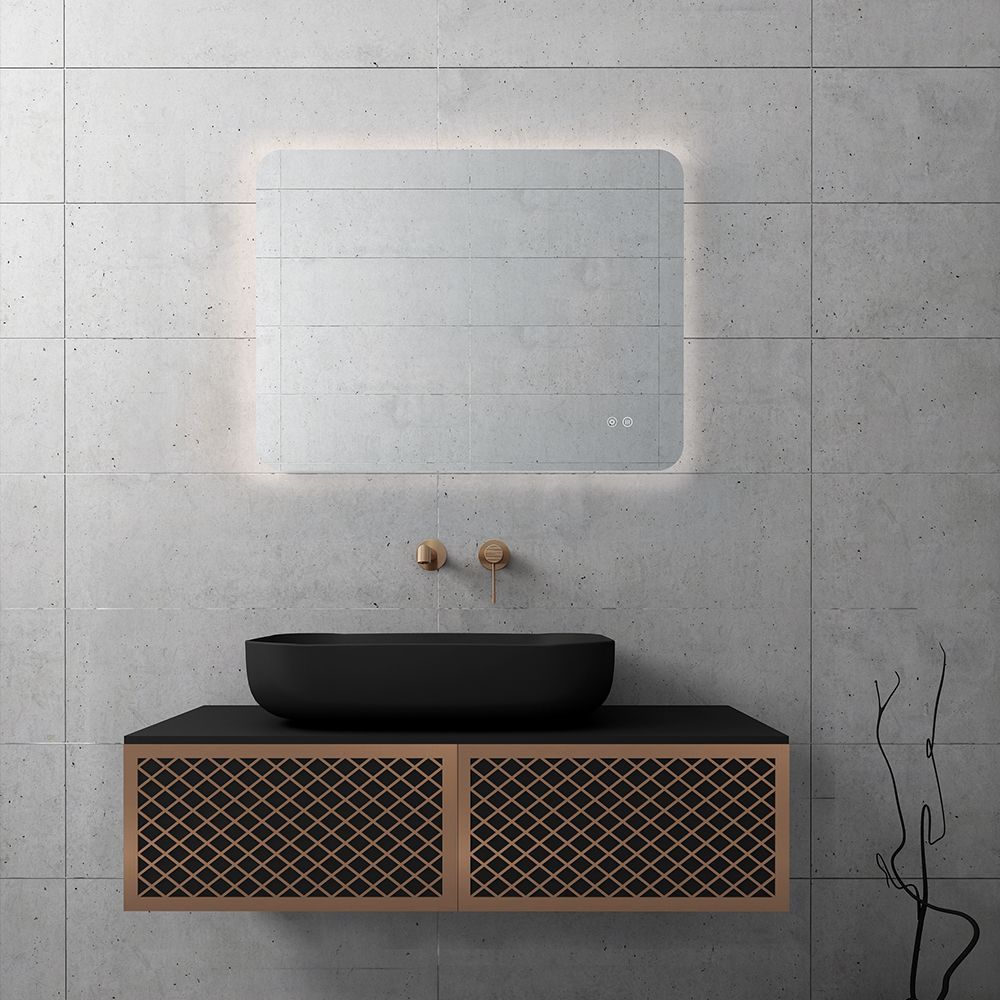 Υλικό επίπλου MDF super matt, anti-spot, για μεγαλύτερη αντοχή στο χρόνο. Ανακλινόμενο πορτάκι με χρωμέ κουμπάσο, δύο μεντεσέδες (χρωμέ ή μαύροι ανάλογα με το χρώμα της βάσης)  και μηχανισμό ανοίγματος push. Ο πάγκος κατασκευάζεται από υλικά ματ υψηλής αντοχής στην κρούση, στην κάμψη και στην τριβή με σχεδόν μηδενική απορρόφηση υγρασίας. Προτείνεται η επιλογή καθρέπτη LED με κρυφό φωτισμό και 2 κουμπιά με αισθητήρες αφής on/off και anti-fog αντιθαμβωτικό σύστημα με δυνατότητα επιλογής θερμοκρασίας χρώματος φωτός. Στην τιμή δεν συμπεριλαμβάνεται ο νιπτήρας, η μπαταρία και η βαλβίδα του νιπτήρα. Mπορείτε να προσθέσετε επικαθήμενο νιπτήρα και ορειχάλκινη βαλβίδα κλικ-κλακ για νιπτήρες χωρίς υπερχείλιση. Ομοίως μπορείτε να προσθέσετε μπαταρία νιπτήρος που φέρει την υπογραφή κορυφαίων εταιρειών στον σχεδιασμό ειδών υγιεινής, όπως Pentagono, Orabella by Armando Vicario και Orabella. Προσοχή: οι επικαλύψεις παραδίδονται ατρύπητες.