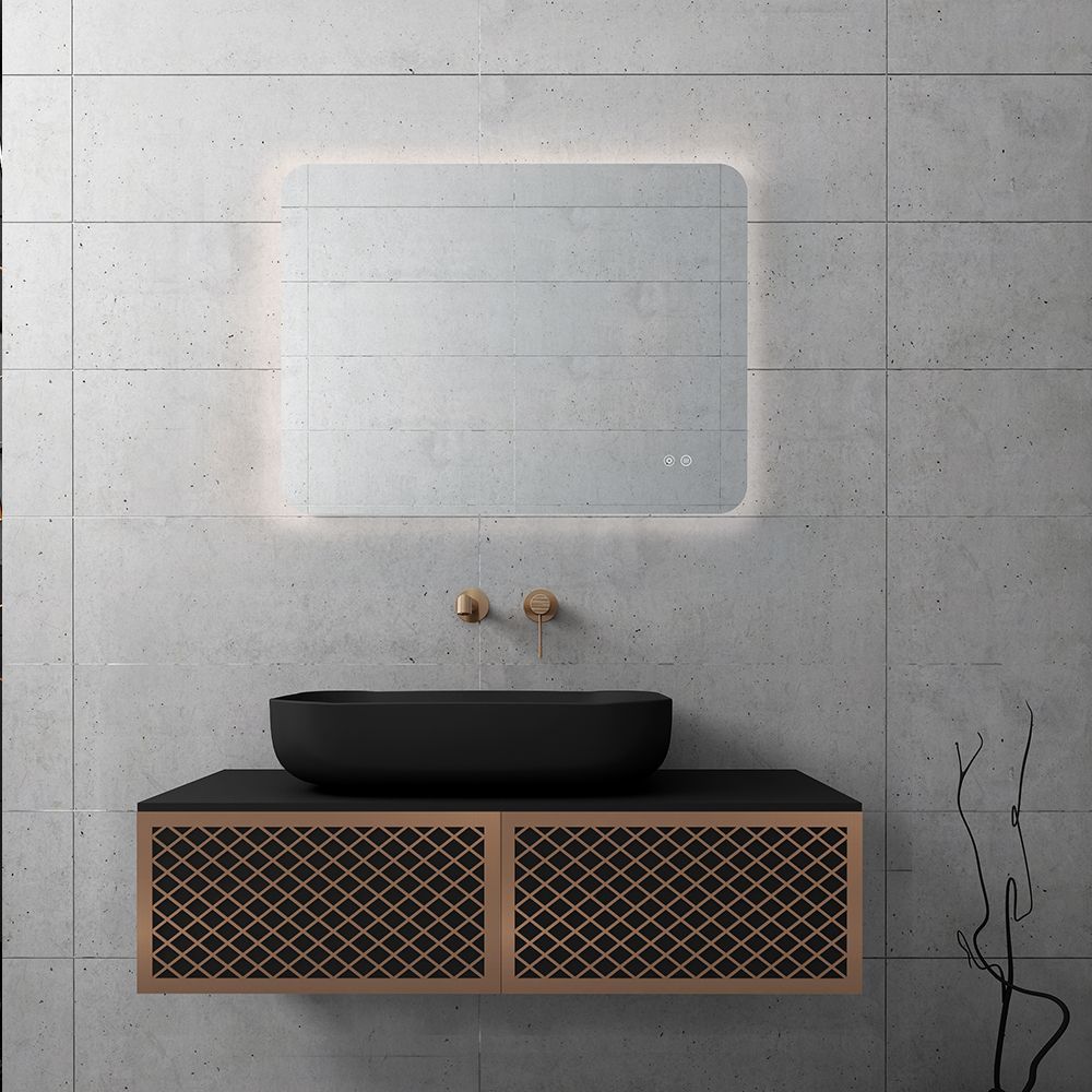 Υλικό επίπλου MDF super matt, anti-spot, για μεγαλύτερη αντοχή στο χρόνο. Ανακλινόμενο πορτάκι με χρωμέ κουμπάσο, δύο μεντεσέδες (χρωμέ ή μαύροι ανάλογα με το χρώμα της βάσης) και μηχανισμό ανοίγματος push. Ο πάγκος κατασκευάζεται από υλικά ματ υψηλής αντοχής στην κρούση, στην κάμψη και στην τριβή με σχεδόν μηδενική απορρόφηση υγρασίας. Προτείνεται η επιλογή καθρέπτη LED με κρυφό φωτισμό και 2 κουμπιά με αισθητήρες αφής on/off και anti-fog αντιθαμβωτικό σύστημα με δυνατότητα επιλογής θερμοκρασίας χρώματος φωτός. Στην τιμή δεν συμπεριλαμβάνεται ο νιπτήρας, η μπαταρία και η βαλβίδα του νιπτήρα. Mπορείτε να προσθέσετε επικαθήμενο νιπτήρα και ορειχάλκινη βαλβίδα κλικ-κλακ για νιπτήρες χωρίς υπερχείλιση. Ομοίως μπορείτε να προσθέσετε μπαταρία νιπτήρος που φέρει την υπογραφή κορυφαίων εταιρειών στον σχεδιασμό ειδών υγιεινής, όπως Pentagono, Orabella by Armando Vicario και Orabella. Προσοχή: οι επικαλύψεις παραδίδονται ατρύπητες.