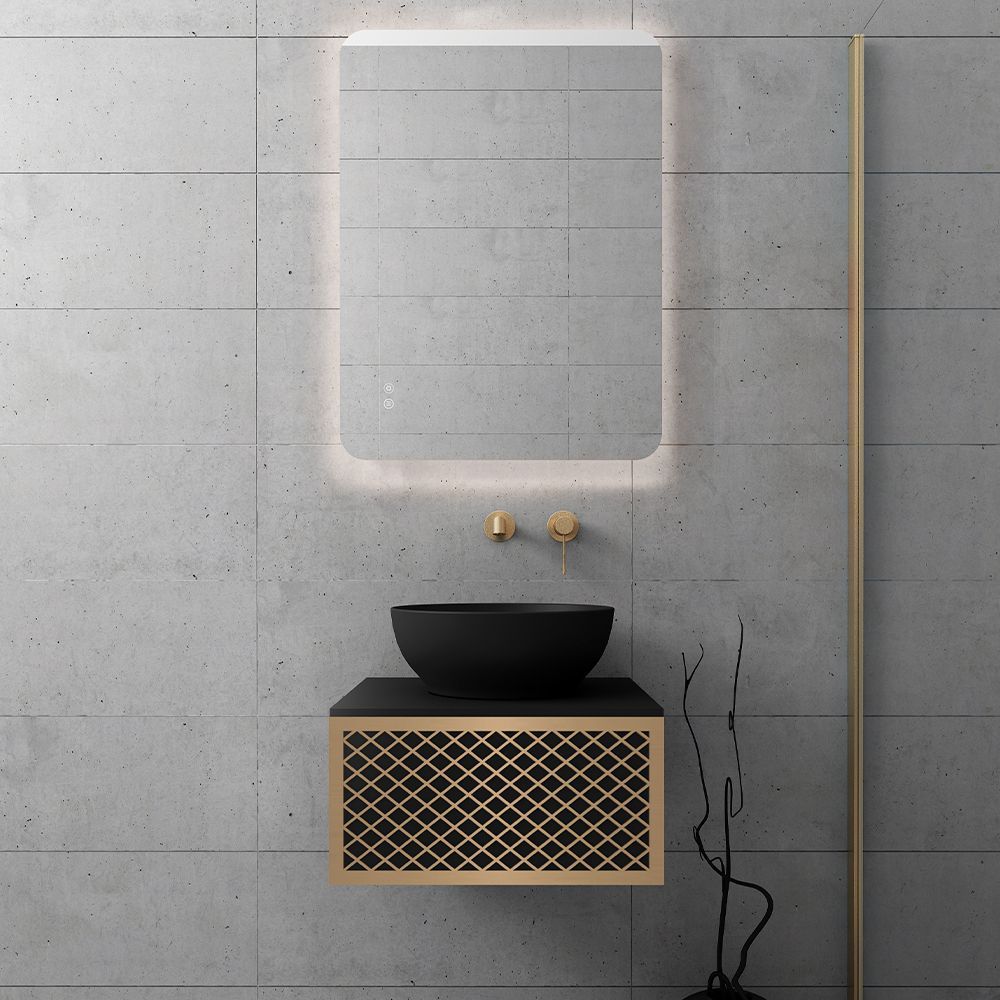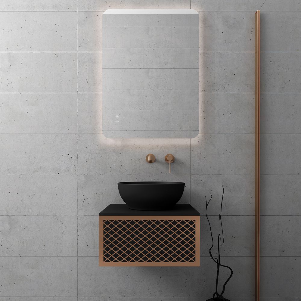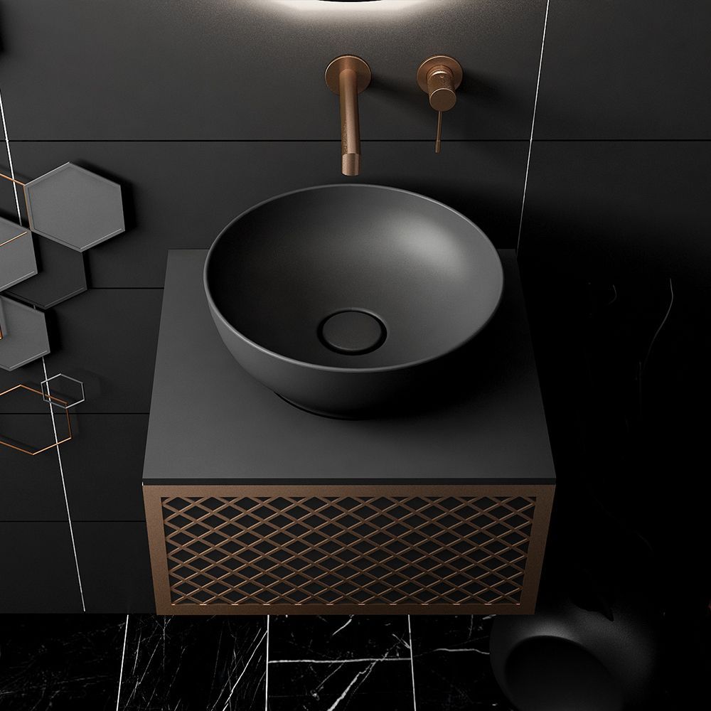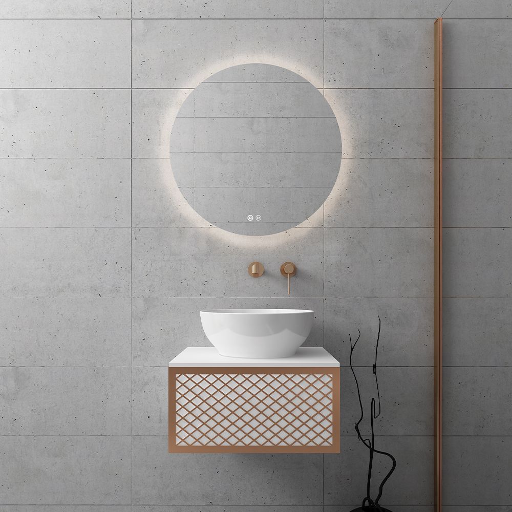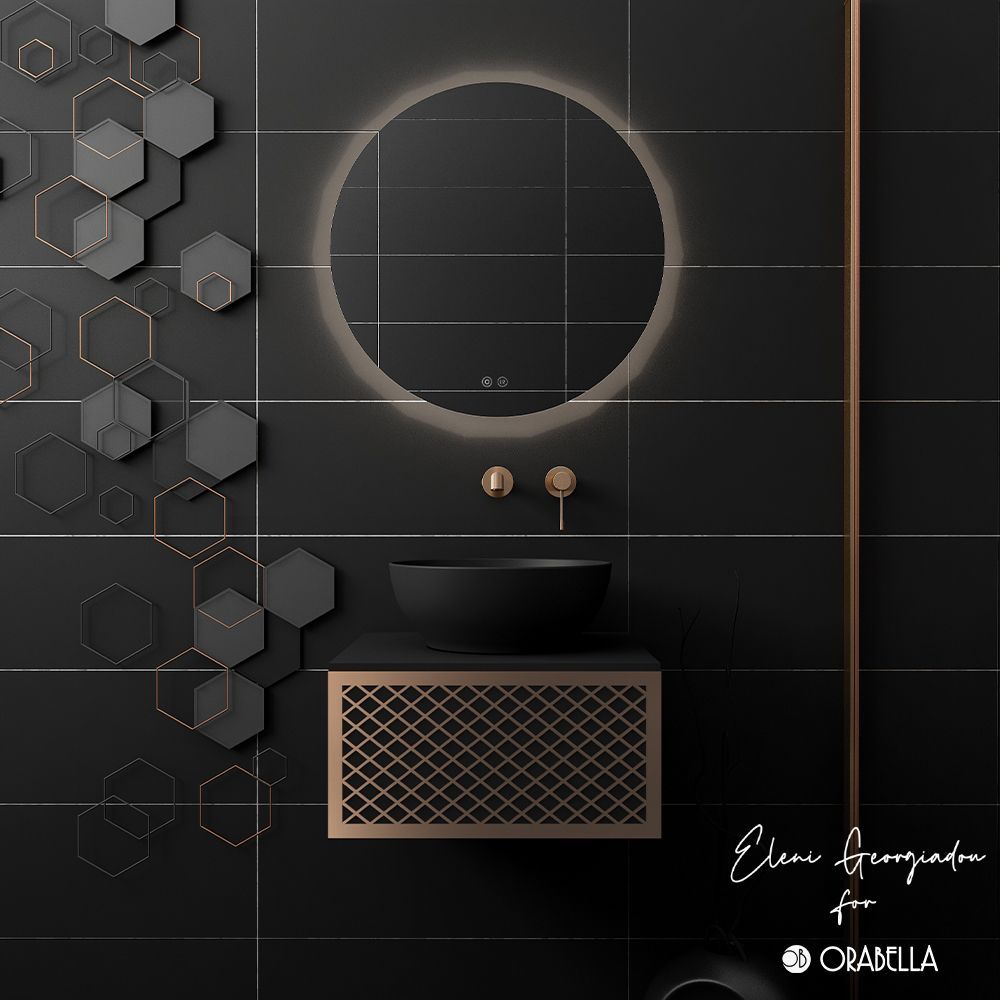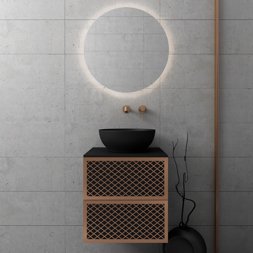 Υλικό επίπλου MDF super matt, anti-spot, για μεγαλύτερη αντοχή στο χρόνο. Ανακλινόμενο πορτάκι με χρωμέ κουμπάσο, δύο μεντεσέδες (χρωμέ ή μαύροι ανάλογα με το χρώμα της βάσης)  και μηχανισμό ανοίγματος push. Ο πάγκος κατασκευάζεται από υλικά ματ υψηλής αντοχής στην κρούση, στην κάμψη και στην τριβή με σχεδόν μηδενική απορρόφηση υγρασίας. Προτείνεται η επιλογή καθρέπτη LED με κρυφό φωτισμό και 2 κουμπιά με αισθητήρες αφής on/off και anti-fog αντιθαμβωτικό σύστημα με δυνατότητα επιλογής θερμοκρασίας χρώματος φωτός. Στην τιμή δεν συμπεριλαμβάνεται ο νιπτήρας, η μπαταρία και η βαλβίδα του νιπτήρα. Mπορείτε να προσθέσετε επικαθήμενο νιπτήρα και ορειχάλκινη βαλβίδα κλικ-κλακ για νιπτήρες χωρίς υπερχείλιση. Ομοίως μπορείτε να προσθέσετε μπαταρία νιπτήρος που φέρει την υπογραφή κορυφαίων εταιρειών στον σχεδιασμό ειδών υγιεινής, όπως Pentagono, Orabella by Armando Vicario και Orabella. Προσοχή: οι επικαλύψεις παραδίδονται ατρύπητες.