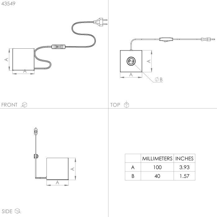 Μήκος Φωτιστικού(σε χιλ./ίντσα):100 / 3,94Πλάτος Φωτιστικού(σε χιλ./ίντσα):100 / 3,94Ύψος Φωτιστικού(σε χιλ./ίντσα):100 / 3,94Καθαρό Βάρος (kg):0,56