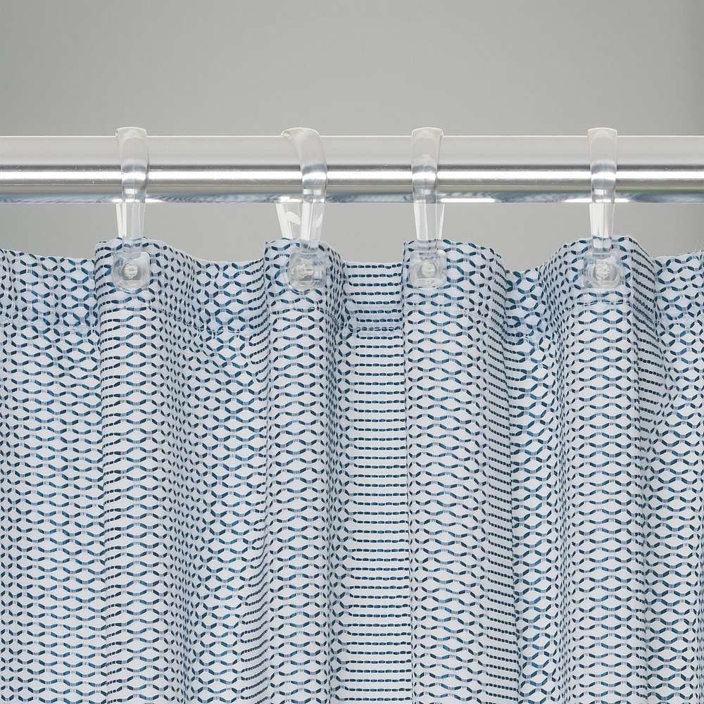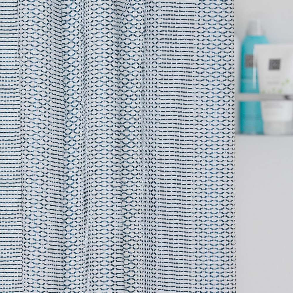 Η κουρτίνα Wave είναι μια εξαιρετικά πολυτελής κουρτίνα μπάνιου από τη Sealskin με υφαντό μοτίβο. Η βάση της κουρτίνας ντους είναι λευκή, ενώ η γεωμετρική ύφανση είναι κατασκευασμένη σε μπλε χρώμα.