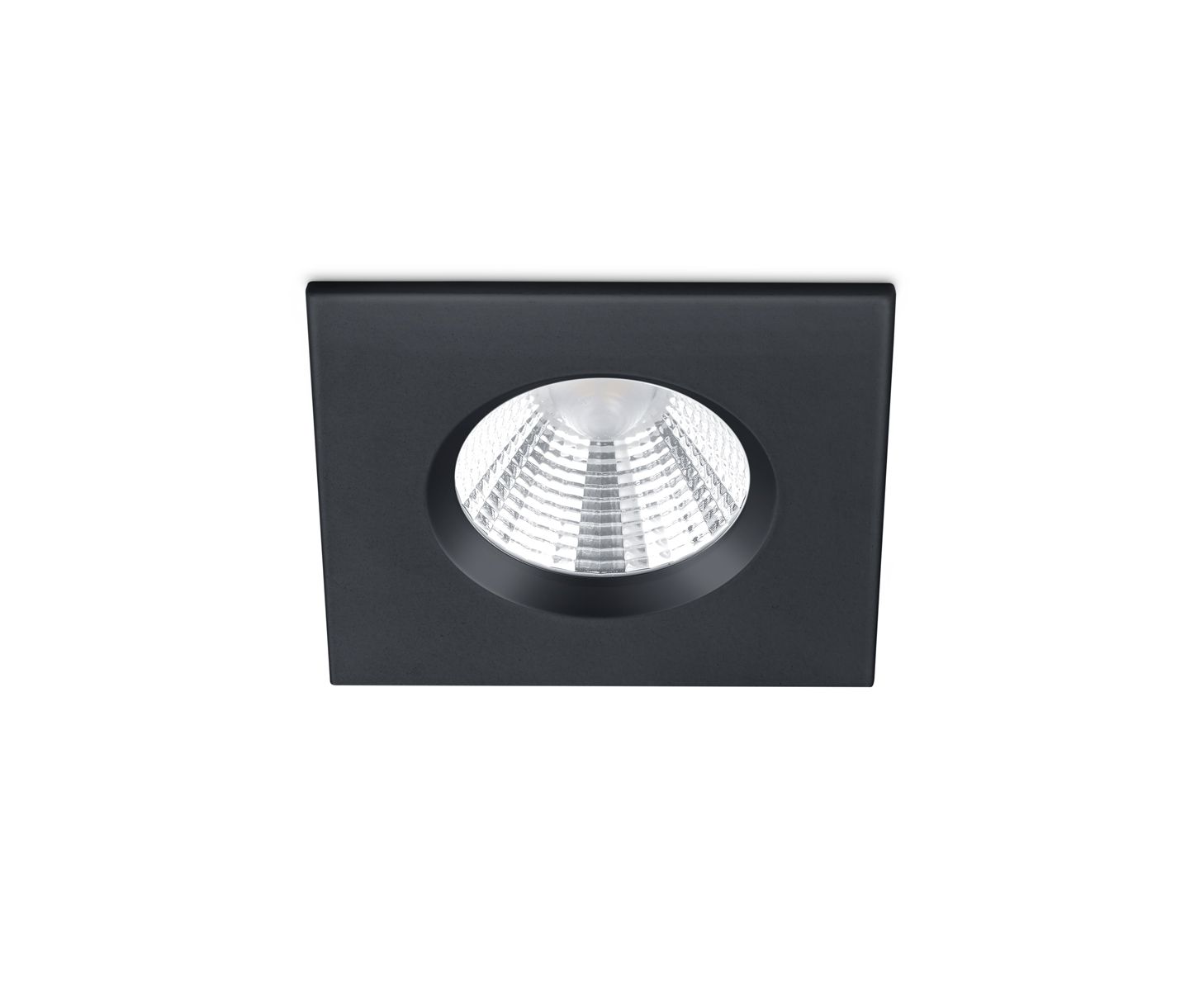 Τετράγωνο χωνευτό σποτ της Trio Lighting από μέταλλο, σε μαύρο χρώμα. To ενσωματωμένο LED που διαθέτει εκπέμπει θερμό λευκό φως, το οποίο αποδίδεται στην κλίμακα Kelvin με τιμές από 2400Κ έως 3800Κ. Οι τόνοι του θερμού λευκού είναι πιο κίτρινοι σε σχέση με το φυσικό φως.